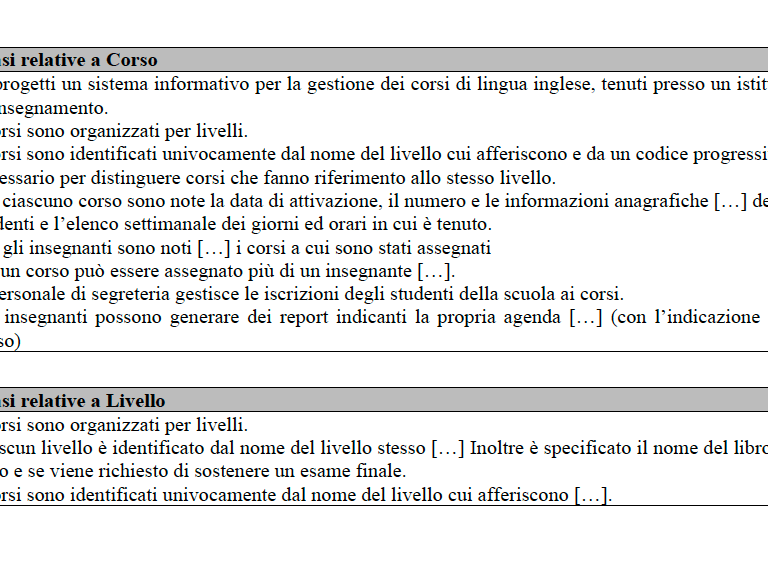 Sulla specifica disabituata si procede alla stesura di un glossario dei termini e al raggruppamento dei requisiti in insiemi omogenei.